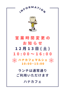 12月13日(土)の営業時間が下記の通り変更になります。